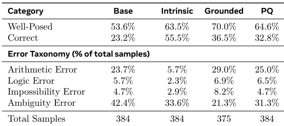 - Synthetic questions need not be correct—only 32.8% of PQ problems are fully correct—but structural coherence and diversity matter more; meta-RL reduces ambiguity errors vs. Base-T.