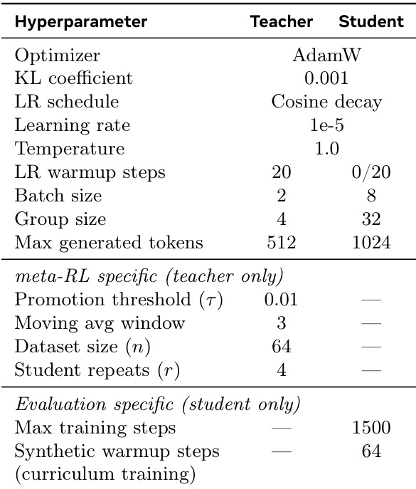 The inner loop involves training the student on a synthetic dataset Xk using RLOO. The student is trained for a small number of steps to induce measurable policy movement while keeping the computational cost low. After each inner loop, the student reverts to the baseline policy for the next iteration. To address the challenge of the teacher adapting to an improving student, a promotion mechanism is introduced. A moving average of the teacher rewards is tracked, and when it exceeds a fixed threshold τ, the student baseline is reset to the best-performing student policy from the previous iteration. This accumulated dataset, which led to student promotion, is stored as the "Promotion Questions" (PQ) for evaluation.