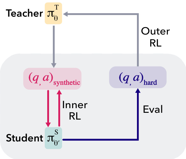 The core of the framework is a bilevel optimization problem, where the objective is to generate a synthetic dataset X that, when used to train the student, maximizes the student's performance on the target domain. To make this computationally feasible, the authors instantiate this objective as a nested meta-RL loop. The outer loop trains the teacher using RLOO (Reinforcement Learning with Out-of-Loop Optimization) to generate synthetic question-answer pairs. The inner loop trains the student using standard RLVR (Reinforcement Learning with Value-based Reward) on the teacher-generated dataset. The key innovation is the grounding of the teacher's reward signal in the student's actual performance on the hard problems, rather than using intrinsic rewards. This black-box reward signal ensures that the teacher is penalized for generating degenerate or unhelpful problems and is rewarded only when the synthetic curriculum leads to genuine learning progress.