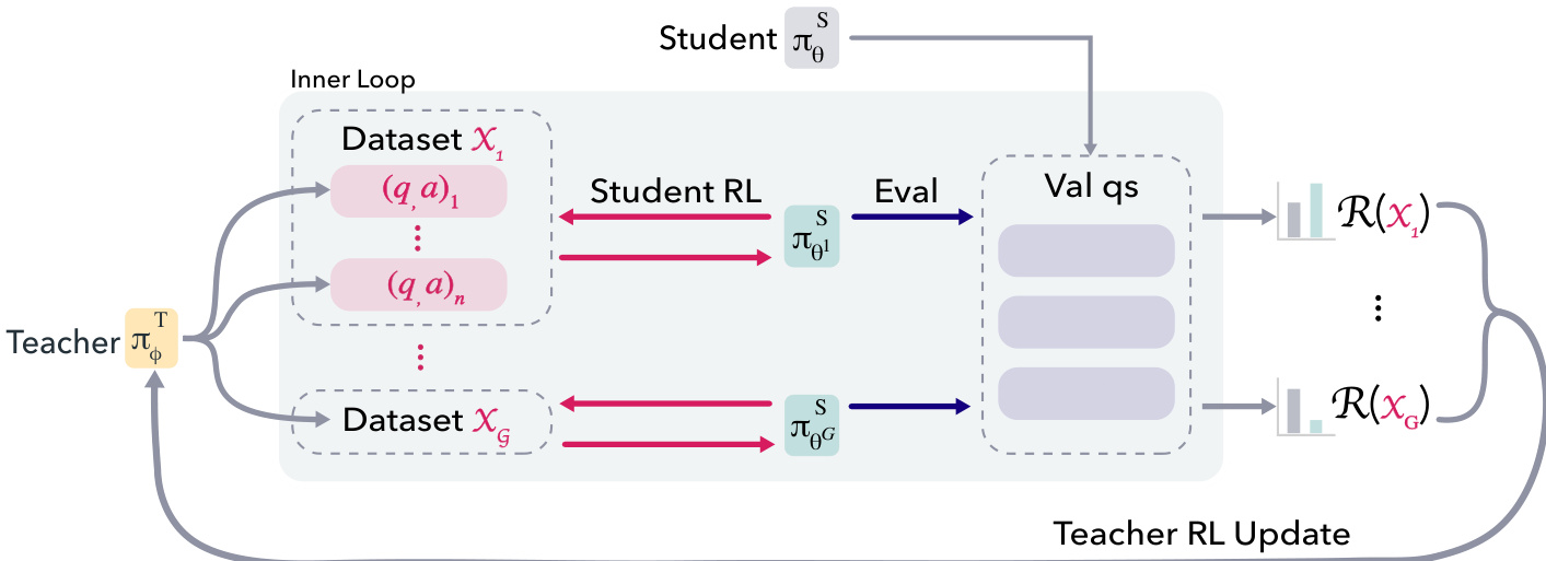 In the outer loop, the teacher generates a batch of g⋅n synthetic question-answer pairs, which are partitioned into g datasets of size n. For each dataset Xk, the inner loop is executed. This involves training the student for a fixed number of steps (10) on Xk and then evaluating the resulting student policy on a subsampled set of hard questions QR from the original training set. The reward for the dataset Xk is the average improvement in the student's success rate on QR compared to a baseline student. To mitigate noise, this reward is averaged over r parallel student trainings. The teacher is then updated using the RLOO algorithm based on these dataset-level rewards.