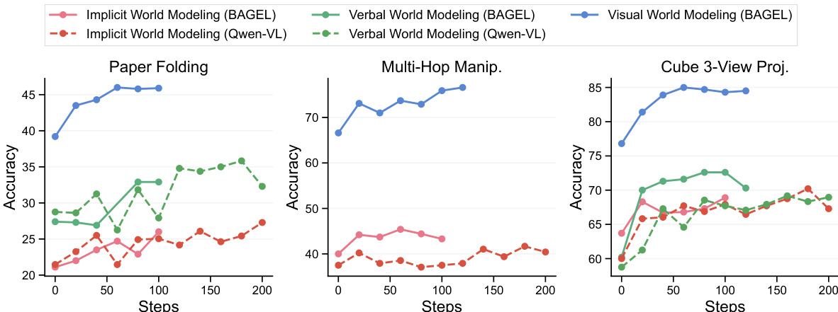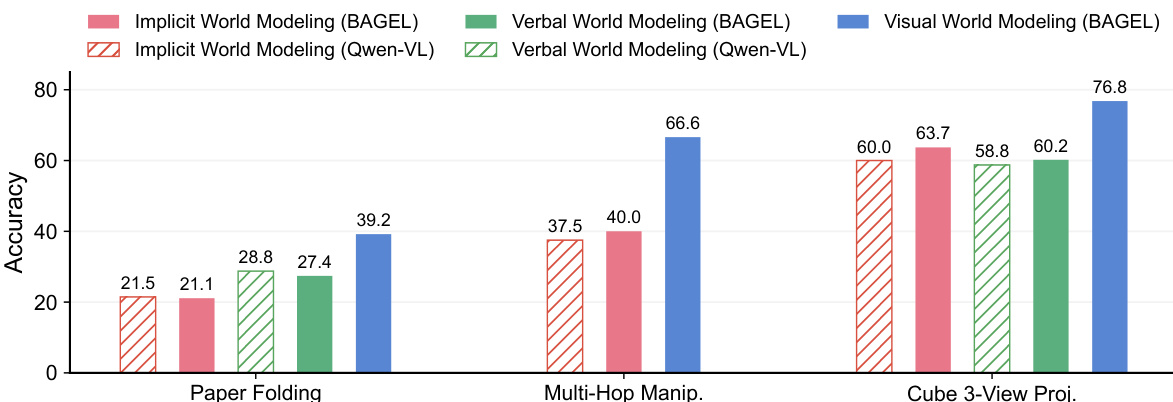 The authors use a bar chart to compare the performance of different models and reasoning methods on three tasks: Paper Folding, Multi-Hop Manipulation, and Cube 3-View Projection. Results show that visual world modeling consistently outperforms verbal and implicit world modeling across all tasks, with the largest gains observed in Multi-Hop Manipulation and Cube 3-View Projection. In Paper Folding, visual world modeling achieves the highest accuracy, while implicit and verbal world modeling show similar, lower performance.