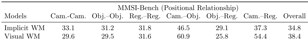 The authors compare implicit and visual world modeling on MMSI-Bench positional relationship tasks, showing that visual world modeling achieves higher accuracy on Cam.-Obj. and Cam.-Reg. subtasks, while implicit world modeling performs better on Obj.-Obj. and Obj.-Reg. The overall performance of visual world modeling is higher, indicating its effectiveness in spatial reasoning.