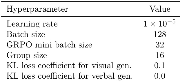 The authors use supervised fine-tuning with specific hyperparameters, including a learning rate of 1×10−5, a batch size of 128, and a GRPO mini batch size of 32, to train their models. The KL loss coefficient for visual generation is set to 0.1, while the coefficient for verbal generation is 0.0, indicating a focus on visual generation during training.