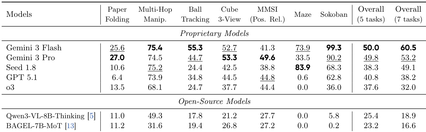 The authors use the VisWorld-Eval suite to evaluate advanced VLMs, reporting zero-shot performance across seven tasks. Results show that Gemini 3 Flash and Gemini 3 Pro significantly outperform other models, particularly on complex tasks like paper folding and ball tracking, though overall performance remains suboptimal.