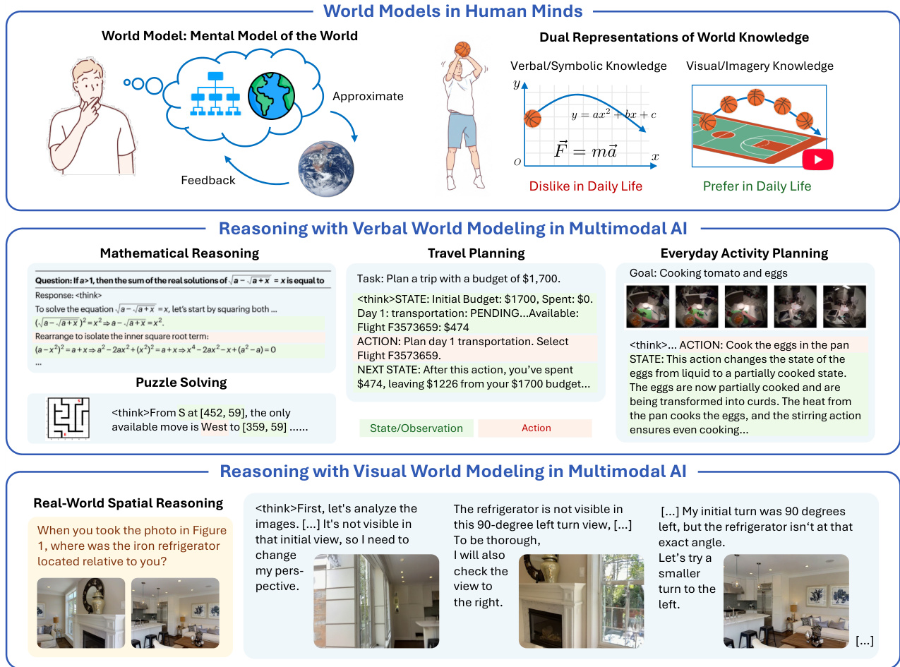 The authors leverage unified multimodal models (UMMs) to explore how visual generation enhances reasoning by acting as explicit visual world models—complementing the verbal world models embedded in large language models. While current AI systems excel in abstract domains using verbal chain-of-thought reasoning, they struggle with physical and spatial tasks due to representational bottlenecks and insufficient visual prior knowledge. The authors introduce the “visual superiority hypothesis,” arguing that for tasks grounded in the physical world, visual generation provides richer, more grounded representations. Their main contribution is a principled theoretical framework linking world modeling to reasoning, plus the VisWorld-Eval benchmark—a controlled suite of tasks designed to isolate when visual generation helps. Empirical results show interleaved verbal-visual CoT significantly improves performance on tasks requiring spatial or physical simulation, but offers no gain on simpler symbolic tasks like Sokoban, validating their hypothesis.