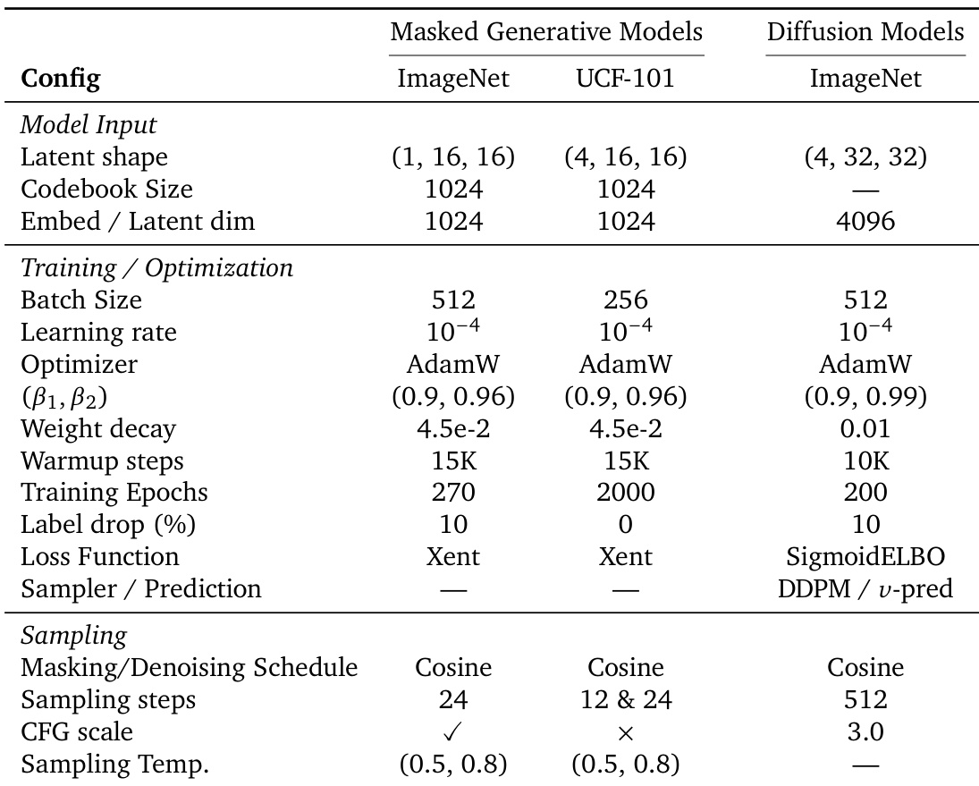 The the the table outlines the training and sampling configurations for masked generative and diffusion models on ImageNet and UCF-101 datasets. It specifies differences in input dimensions, optimization parameters, and sampling strategies between the two model types. Masked generative models use a smaller batch size and fewer training epochs compared to diffusion models. Diffusion models employ a higher number of sampling steps and a different loss function than masked generative models. Both model types use AdamW optimizer but differ in learning rates, weight decay, and sampling schedules.