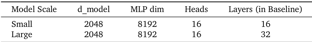 The the the table provides architectural specifications for different model scales, showing that both Small and Large models have the same model dimension and number of attention heads, but differ in the number of layers. The Large model has twice the number of layers compared to the Small model. Small and Large models share the same model dimension and number of attention heads. The Large model has twice as many layers as the Small model. Model scaling is achieved by increasing the number of layers while keeping other dimensions constant.