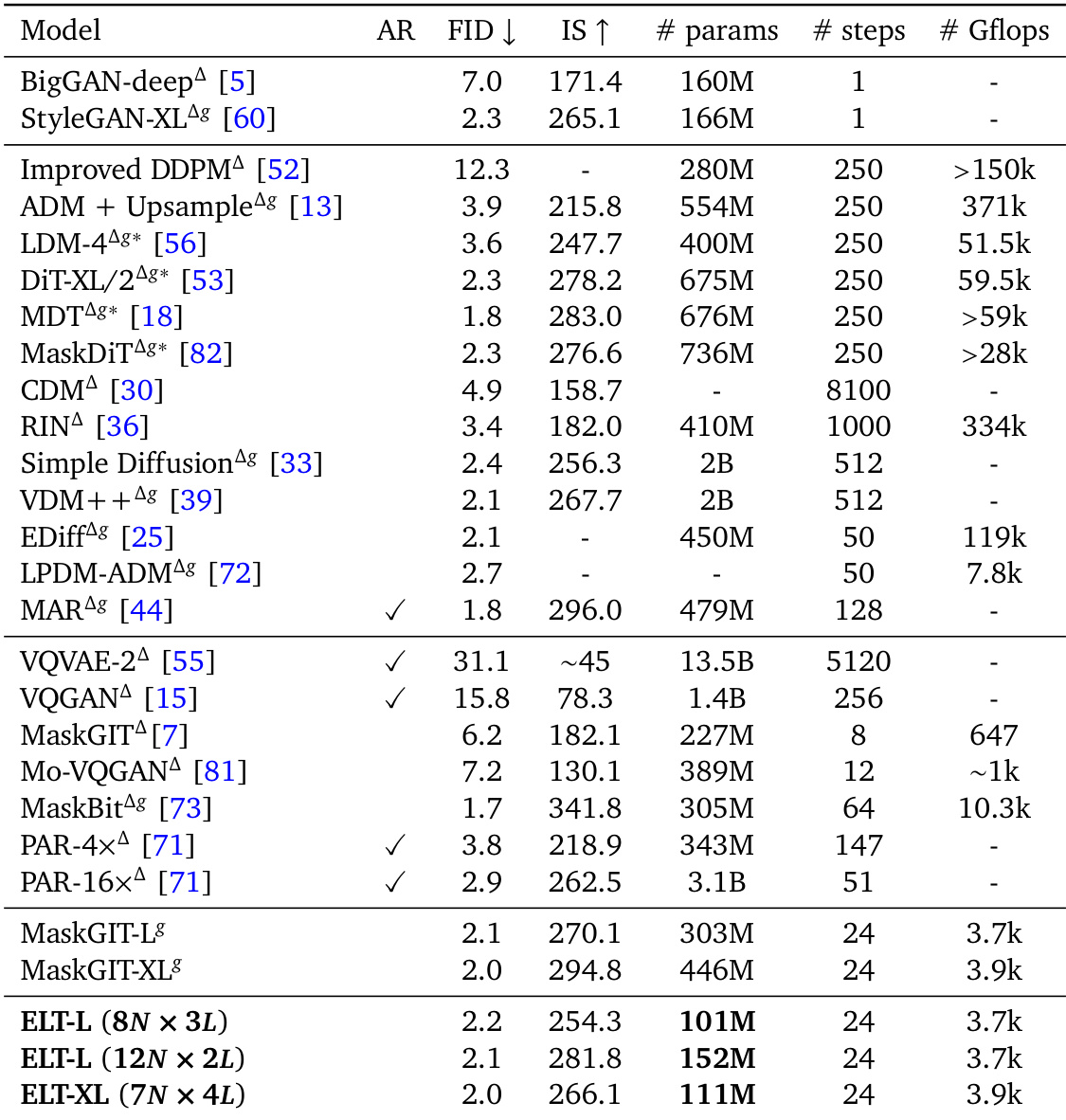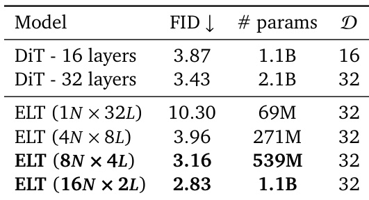 The authors compare different models for class-conditional image generation on ImageNet, evaluating their performance in terms of FID and parameter count. Results show that ELT achieves competitive or better FID scores with significantly fewer parameters compared to DiT baselines, demonstrating parameter efficiency and effective scaling through looped inference. ELT achieves lower FID than DiT with fewer parameters ELT maintains high performance across different inference loop configurations ELT demonstrates parameter efficiency compared to standard DiT models