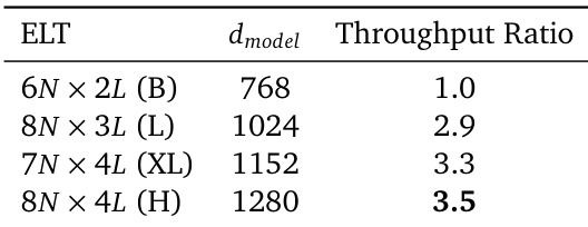 The the the table presents throughput ratios for different ELT model configurations, showing that larger models achieve higher throughput relative to their baselines. The results indicate that ELT's parameter efficiency leads to improved inference speed, with the highest gain observed for the largest model scale. Larger ELT models exhibit higher throughput ratios compared to smaller models. The throughput improvement is attributed to reduced memory transfers due to shared parameters. The highest throughput ratio is achieved by the largest model configuration.