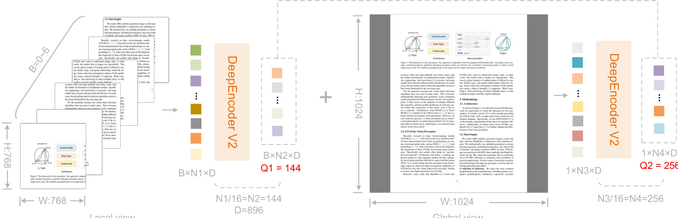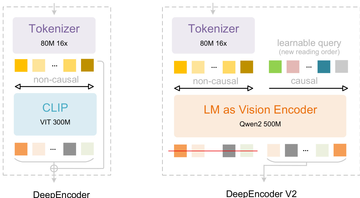 - We introduce DeepEncoder V2, a vision encoder that dynamically reorders visual tokens using causal reasoning derived from image semantics, replacing rigid raster-scan order to better align with human visual perception.