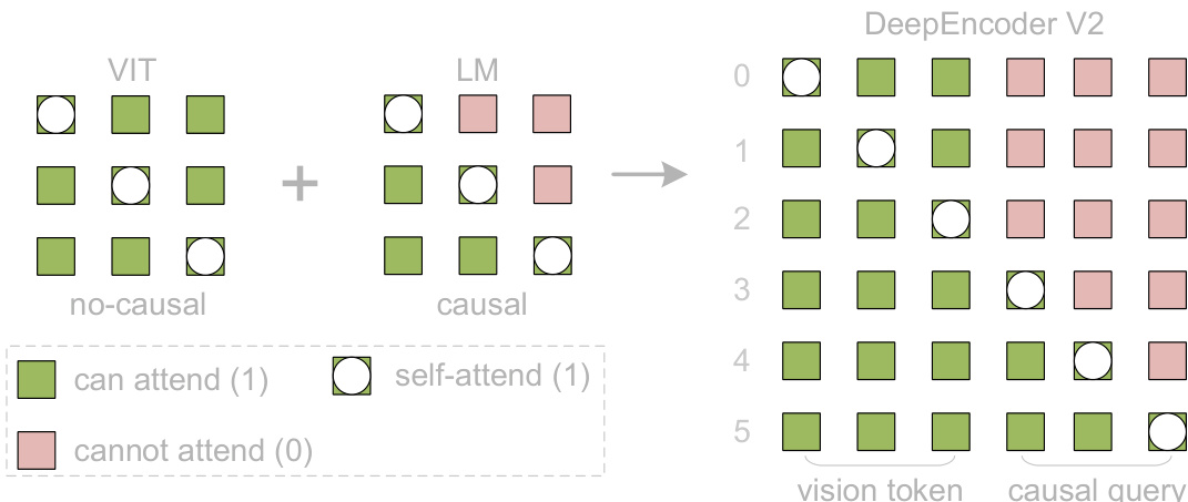 The authors leverage a novel vision encoder, DeepEncoder V2, to challenge the rigid raster-scan token ordering used in most vision-language models, which ignores semantic structure and mimics human visual perception more closely. Prior models treat image patches as fixed sequences, introducing an inductive bias that hinders reasoning over complex layouts like documents or formulas. DeepEncoder V2 introduces causal flow queries and hybrid attention masks to dynamically reorder visual tokens based on semantic context, enabling the model to process images through cascaded 1D causal reasoning—a step toward genuine 2D understanding. Their architecture also lays groundwork for unified multimodal encoding, where shared parameters can process text, vision, and potentially other modalities via modality-specific queries.