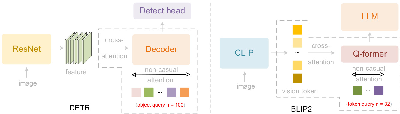 This architecture draws conceptual inspiration from parallelized query mechanisms in DETR and BLIP-2, as shown in the figure below, but adapts them to a causal, decoder-style encoder to bridge 2D spatial structure with 1D language modeling.