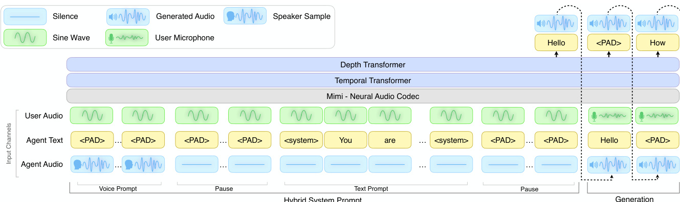 The model employs a Mimi neural audio codec for audio tokenization, followed by a Temporal Transformer and a Depth Transformer to process the multimodal sequence. During training, loss backpropagation is masked for the system prompt tokens to prevent overfitting to prompt structure. To address token imbalance, the authors down-weight the loss on non-semantic audio tokens by a factor of 0.02 and on padded text tokens by 0.3, aligning with the Moshi training objective. The order of the voice and text prompt segments is flexible; in practice, the voice prompt precedes the text prompt to allow prefilling during inference when voice cloning is not required, thereby reducing latency.