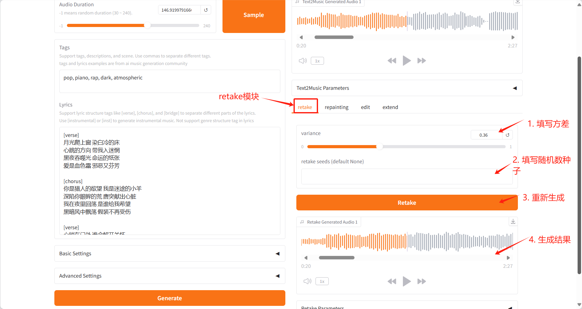 - Sie können zwischen dem Modus „only_lyrics“ (die Originalmelodie beibehalten) oder dem Modus „remix“ (die Melodie ändern) wählen.