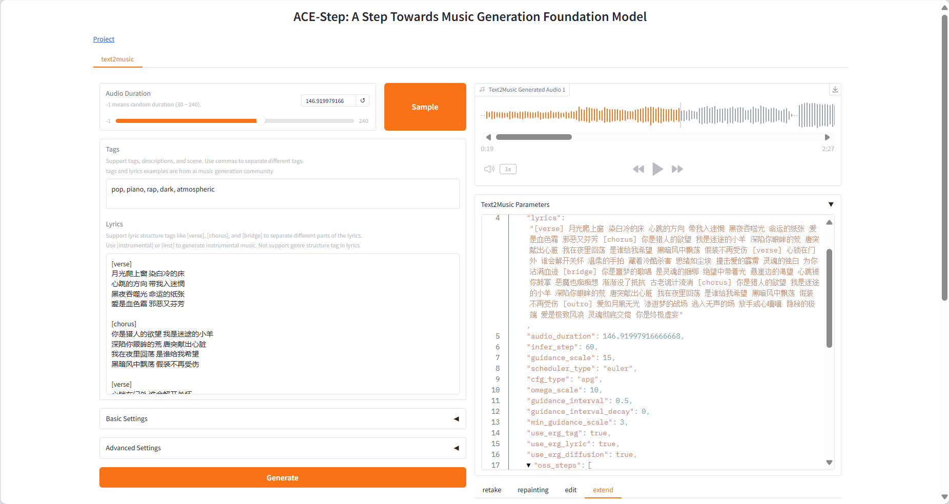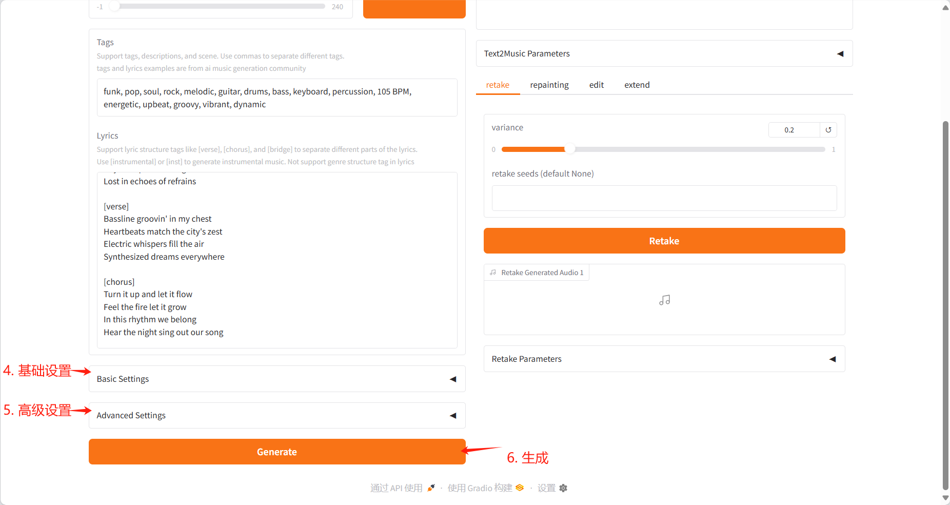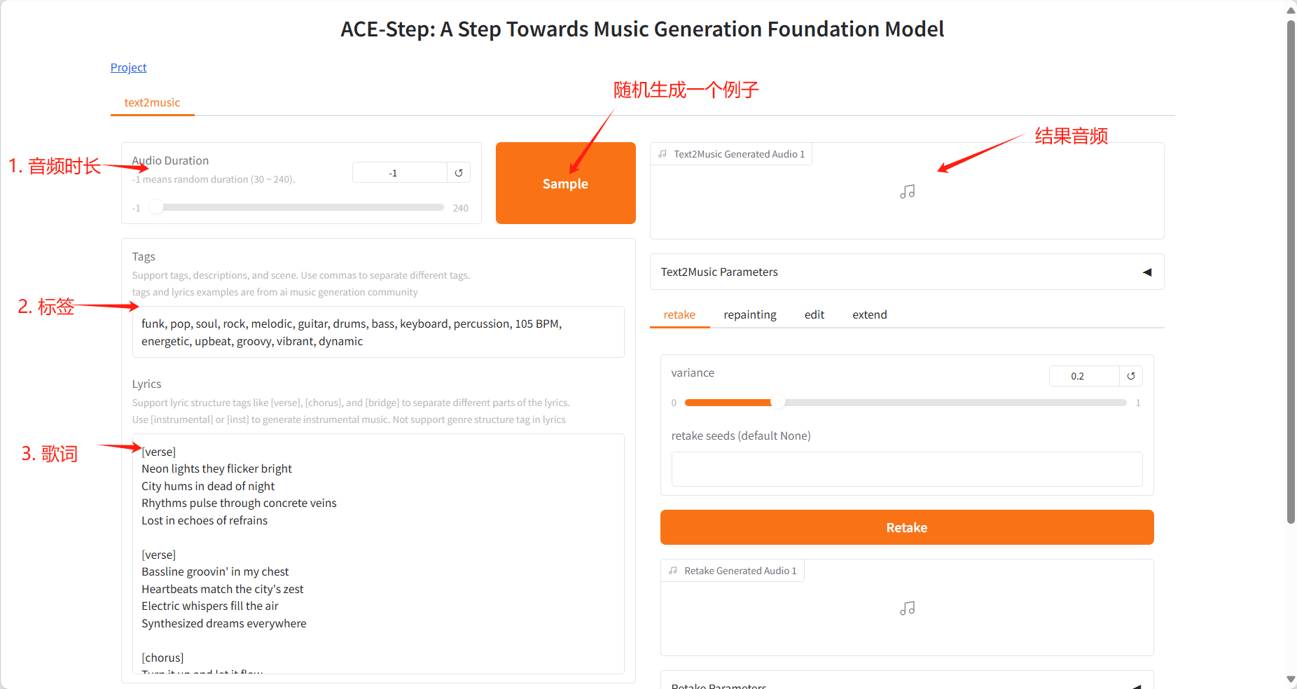 Das Projekt bietet Multitasking-Erstellungsfelder: Registerkarte „Text2Music“, Registerkarte „Retake“, Registerkarte „Repainting“, Registerkarte „Edit“ und Registerkarte „Extend“.