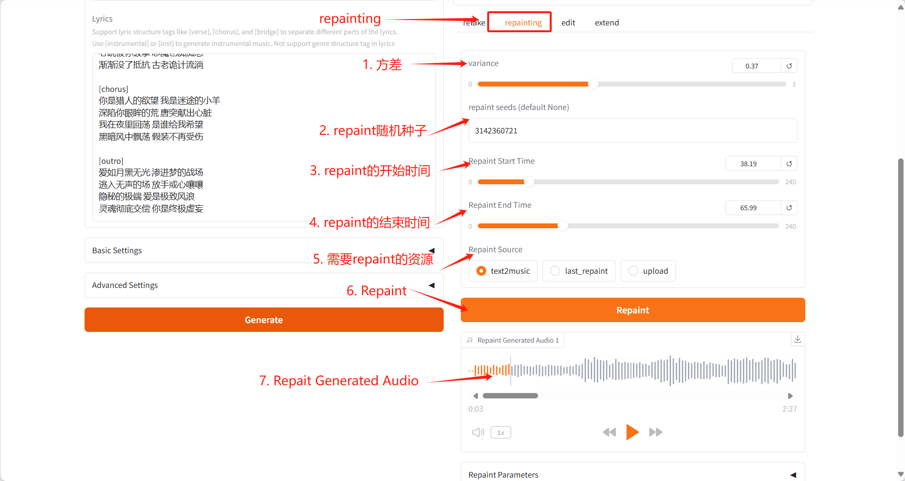 - Wählen Sie das Quellaudio (text2music, last_repaint oder upload)