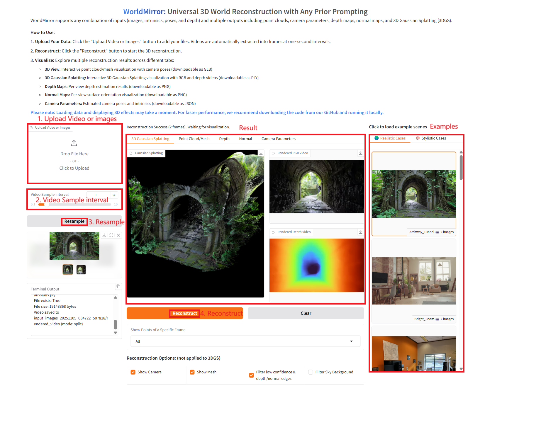 Wenn „Bad Gateway“ angezeigt wird, bedeutet dies, dass das Modell initialisiert wird. Da das Modell groß ist, warten Sie bitte etwa 2–3 Minuten und aktualisieren Sie die Seite. Die erste Rekonstruktion dauert etwa 2 Minuten, das Laden der Daten und die Anzeige der 3D-Effekte können einige Zeit in Anspruch nehmen.