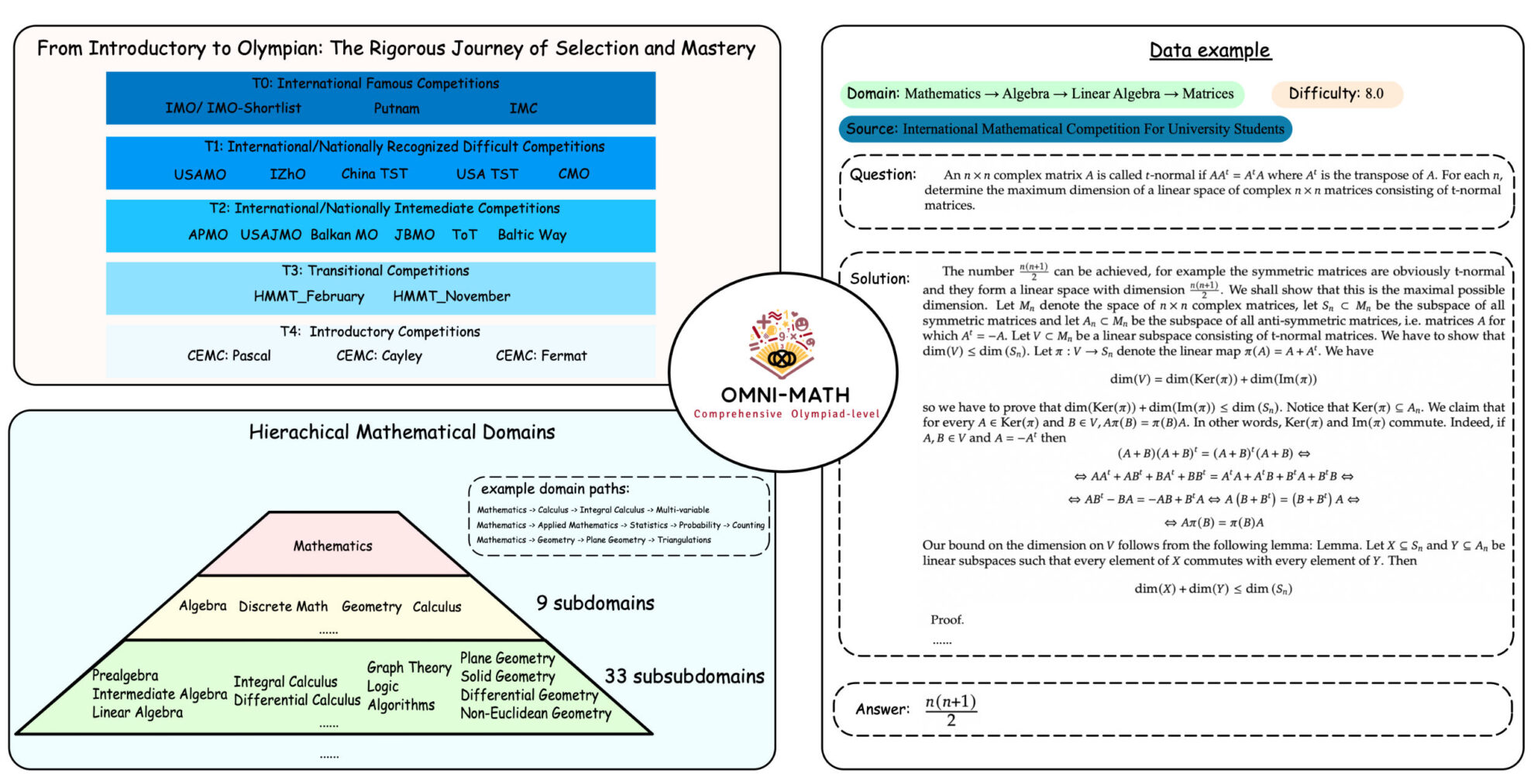Omni-MATH is an Olympic-level mathematical reasoning benchmark dataset created by Peking University and Alibaba, which aims to evaluate the performance of large language models (LLMs) on Olympic-level mathematical problems.Omni-MATH: A Universal Olympiad Level Mathematic Benchmark For Large Language Models".