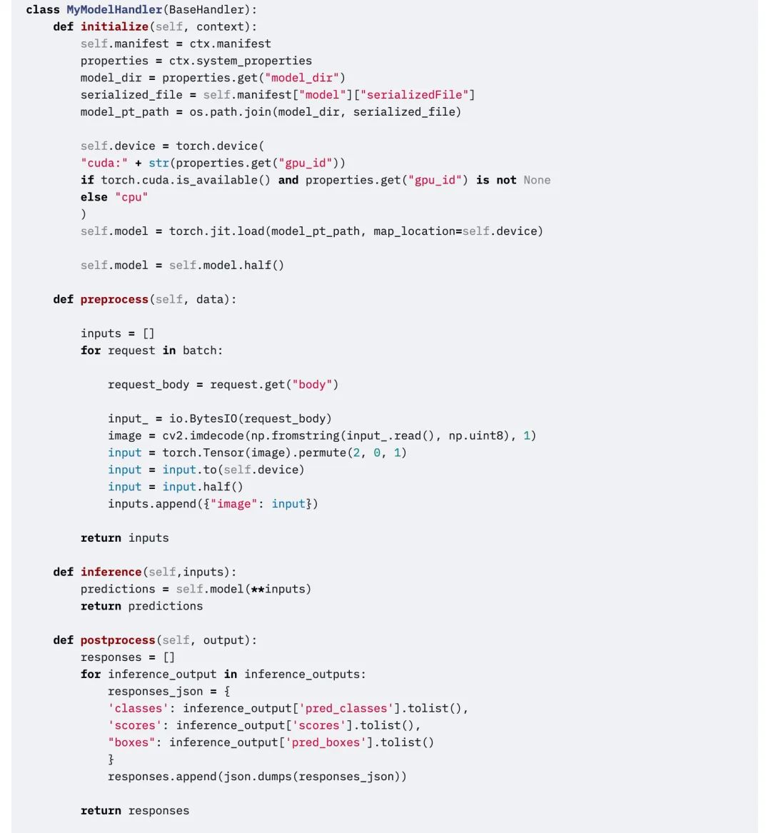 The following code snippet is an example of a custom handler. The custom handler inherits the BaseHandler in TorchServe.Can override any main function.This example demonstrates how to use the handler to load the Detectron2 model to solve the figure detection problem. The model has been exported to Torchscript and used mod.half() Run FP16 inference.