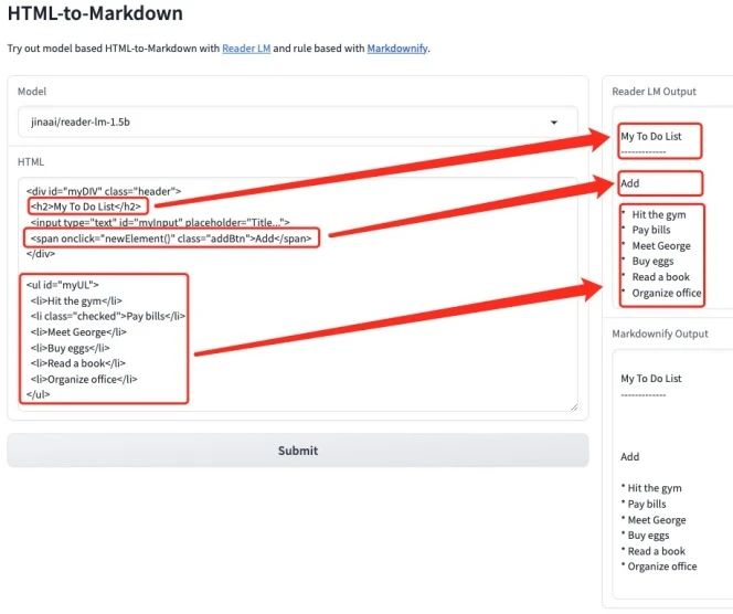 This tutorial demonstrates how to use reader-lm-1.5b or reader-lm-0.5b to convert HTML to markdown. Click the link below and follow the tutorial instructions to experience it.