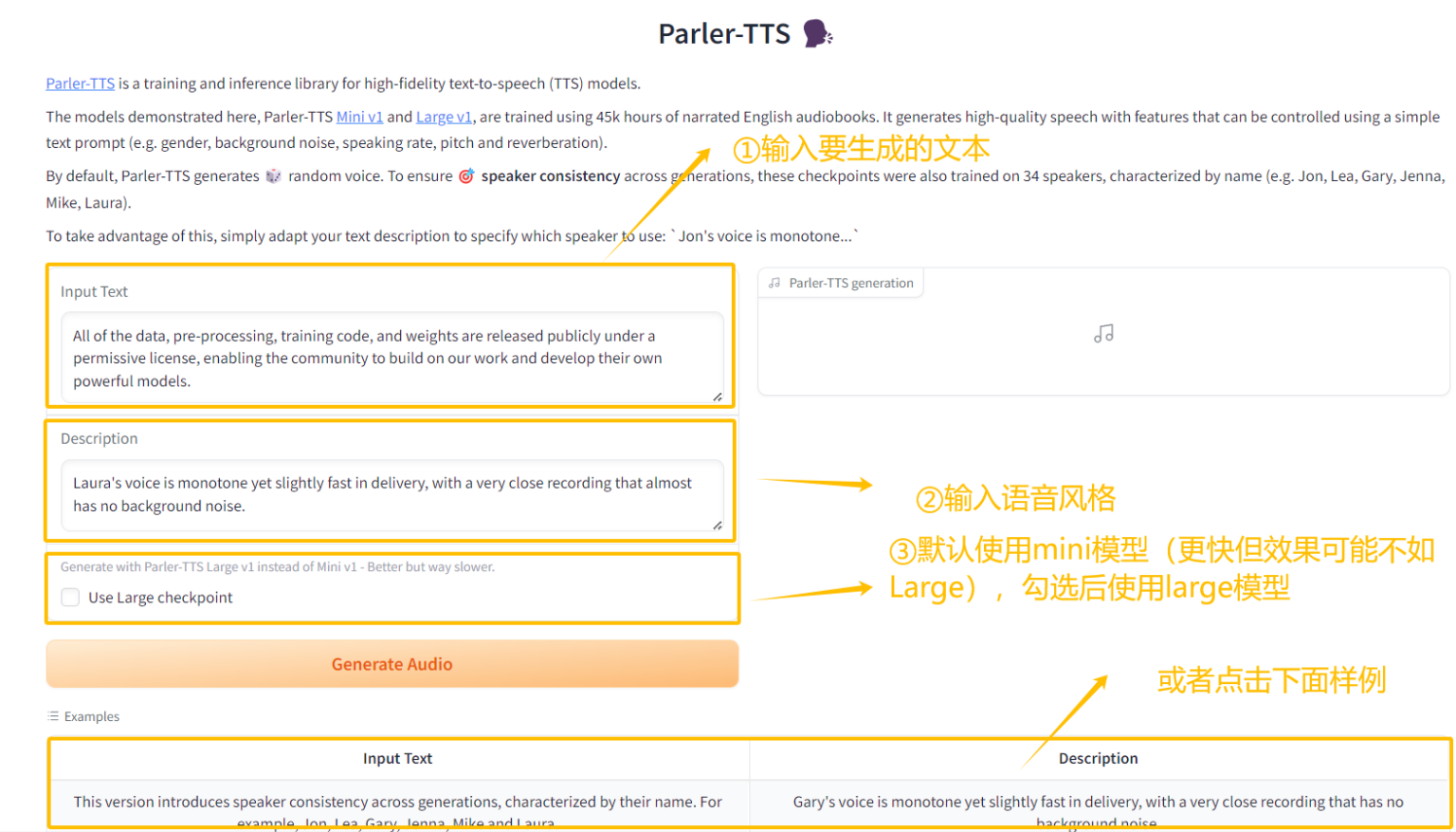 Parler-TTS is a lightweight text-to-speech (TTS) model that can generate high-quality, natural speech in the style of a given speaker. It has a high degree of freedom and innovation, and can control the speaker's gender, timbre, intonation, and scene (indoors, outdoors, on the road, in a concert hall, etc.) through Prompt.