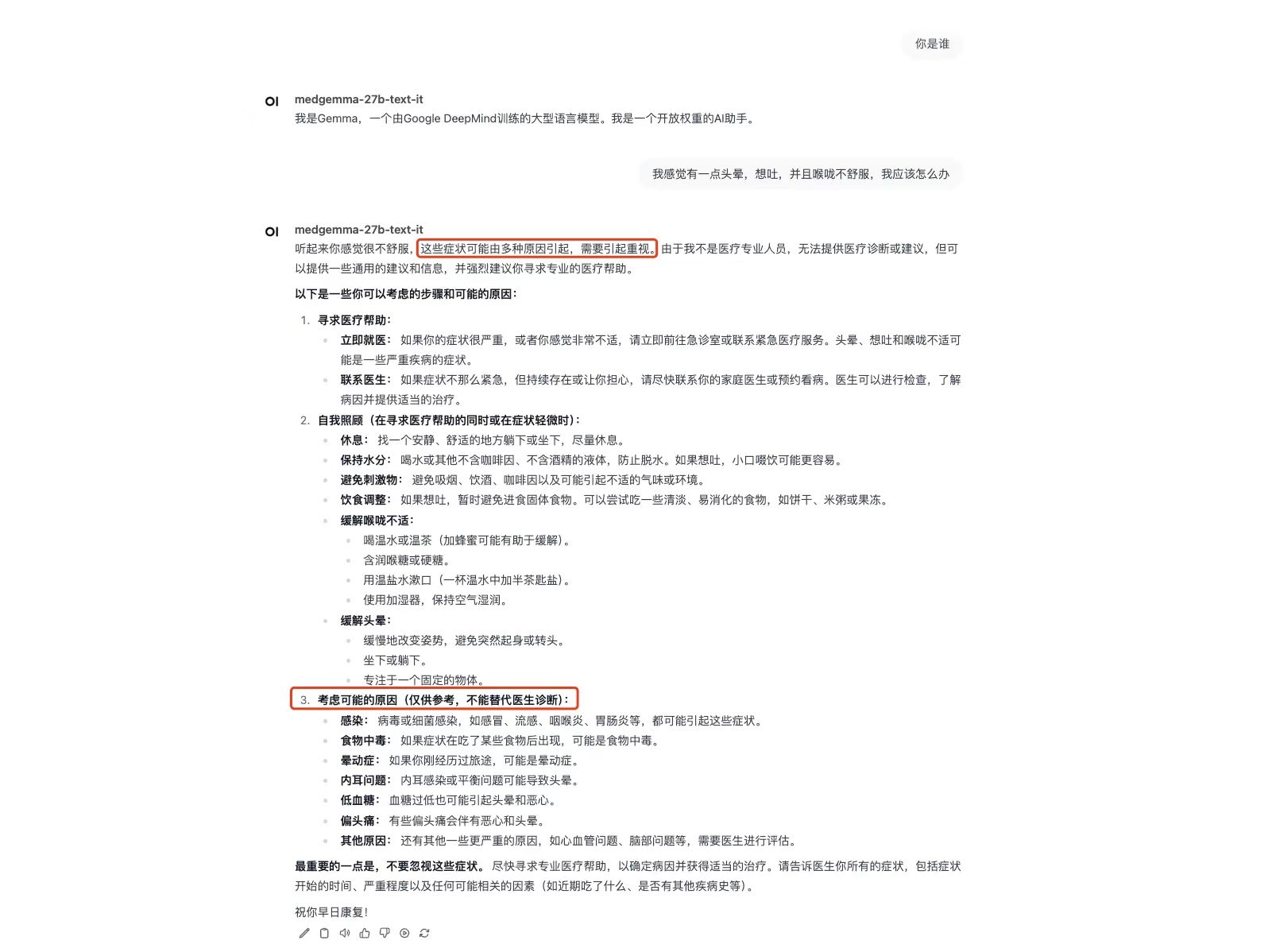 The symptoms described by the author are: "I feel a little dizzy, want to vomit, and my throat is uncomfortable. What should I do?" It can be seen that MedGemma not only provides different solutions of "immediate medical treatment" and "self-care", but also provides the possible causes of this series of symptoms.
