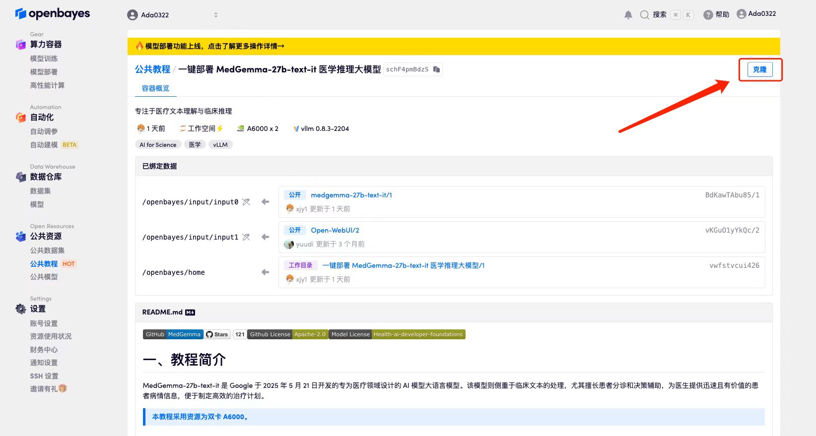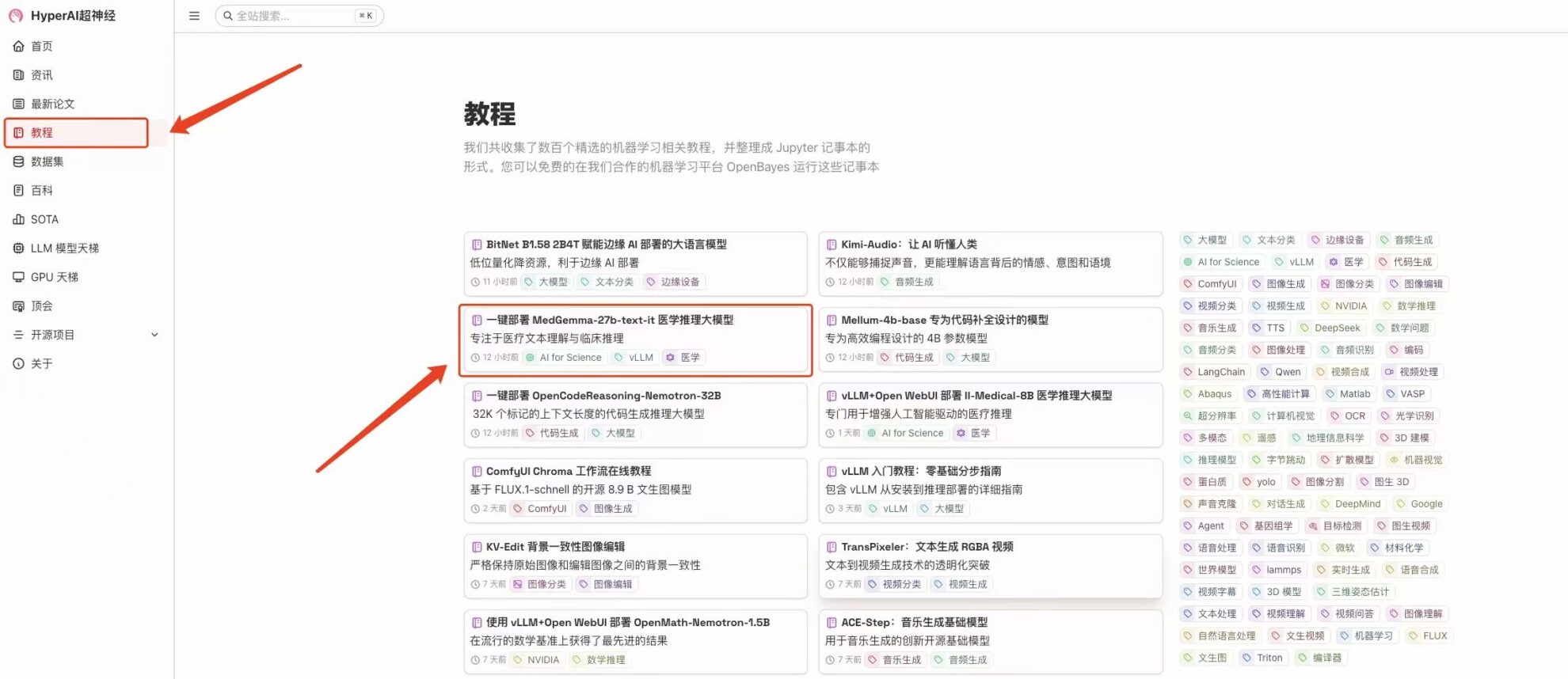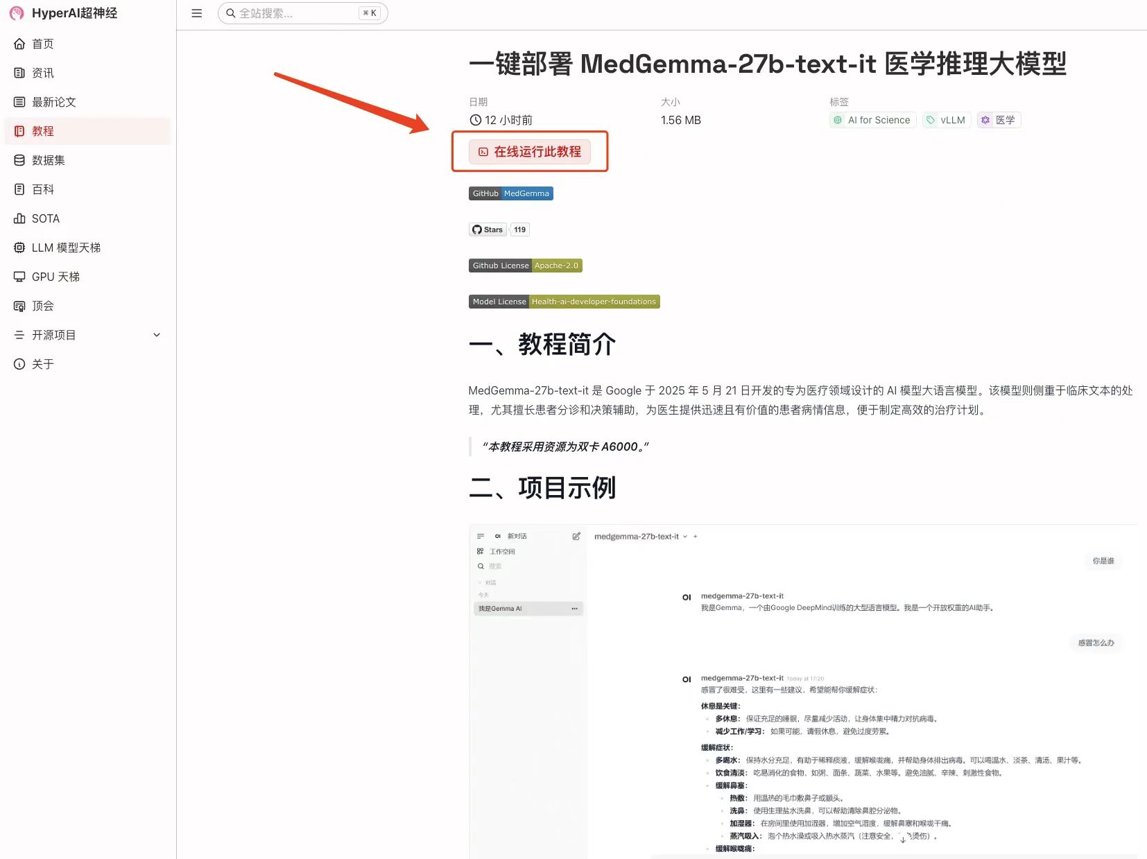 1. After entering the hyper.ai homepage, select the "Tutorial" page, select "One-click deployment of MedGemma-27b-text-it medical reasoning model", and click "Run this tutorial online".