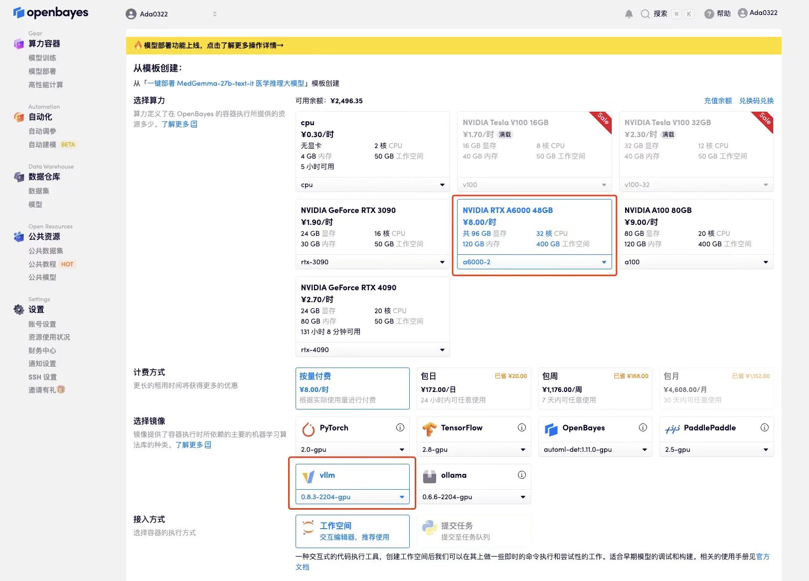 3. Select "NVIDIA A6000 48GB" and "vLLM" image. The OpenBayes platform provides 4 billing methods. You can choose "pay as you go" or "daily/weekly/monthly" according to your needs. Click "Continue". New users can register using the invitation link below to get 4 hours of RTX 4090 + 5 hours of CPU free time!
