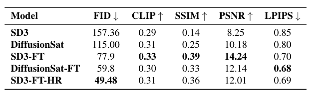 As shown in the figure below. The baseline models SD3 and DiffusionSat have the lowest evaluation scores.However, the latter performs significantly better than the former, which shows the advantages of remote sensing pre-training; and the indicators of all fine-tuning models are significantly improved.SD3-FT performs better in CLIP, SSIM, and PSNR, while DiffusionSat-FT performs better in FID and LPIPS. SD3-FT-HR has the lowest FID (lower FID values indicate higher authenticity), which is 49.48, indicating that its generated images have finer details.