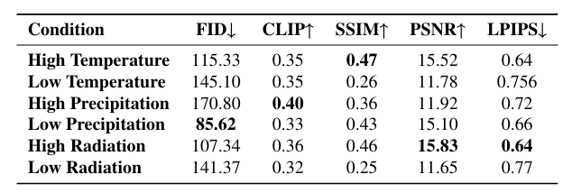 In the climate sensitivity analysis, as shown in the figure below,The vegetation density generated by the model is significantly correlated with climate change.The study conducted a quantitative stress test of the SD3-FT model on samples exhibiting extreme weather conditions. The results showed that under high temperature and high radiation conditions, the FID of the images generated by the model was lower (such as the high radiation FID was 107.34), and the vegetation was more obvious; the opposite was true under low temperature and low radiation conditions, and the simulation effect was slightly worse.