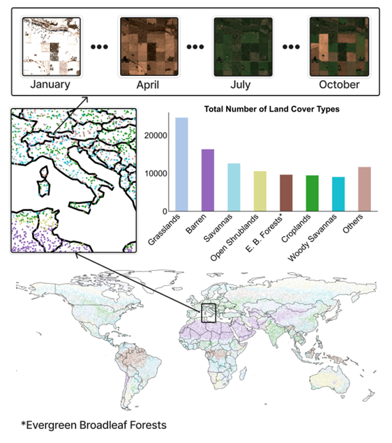 EcoMapper is the largest and most comprehensive remote sensing dataset to date.The dataset consists of 2,904,000 satellite images with climate metadata, sampled from 104,424 geographic locations around the world.It covers 15 different land cover types. As shown in the figure below: