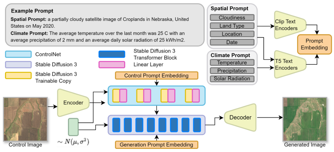 The first one is Stable Diffusion 3.This is a multimodal latent diffusion model that integrates CLIP and T5 text encoders to enable flexible prompt condition settings. The researchers used the collected dataset to fine-tune Stable Diffusion 3 so that it can be based on realistic satellite imagery with geographical, climate, and temporal metadata.