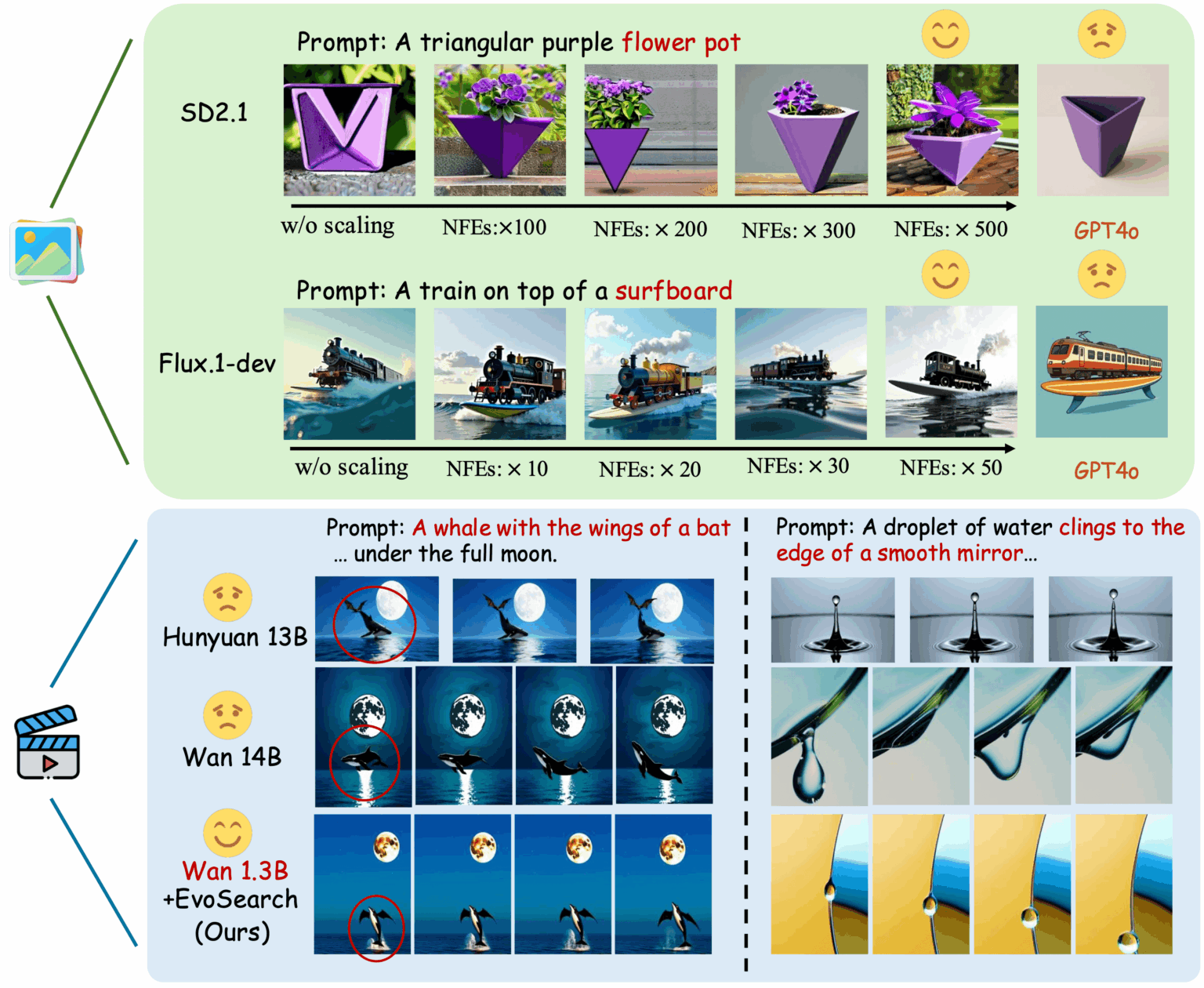 EvoSearch-codes is an Evolutionary Search method launched by the Hong Kong University of Science and Technology and the Kuaishou Keling team. It significantly improves the generation quality of the model by increasing the amount of computation during inference, supports image and video generation, and supports the most advanced diffusion-based and flow-based models. The model can achieve significant optimal results on a series of tasks without training or gradient updates, and exhibits good scaling up capabilities, robustness, and generalization.