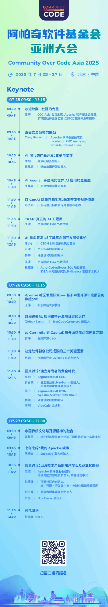 At Community Over Code Asia 2025, we not only discuss code and technology, but also focus on the power of communities that connect people and inspire collective wisdom. As Apache advocates, "Community Over Code". From July 25 to July 27, we sincerely invite you to gather in Beijing to connect wisdom and start the future together.