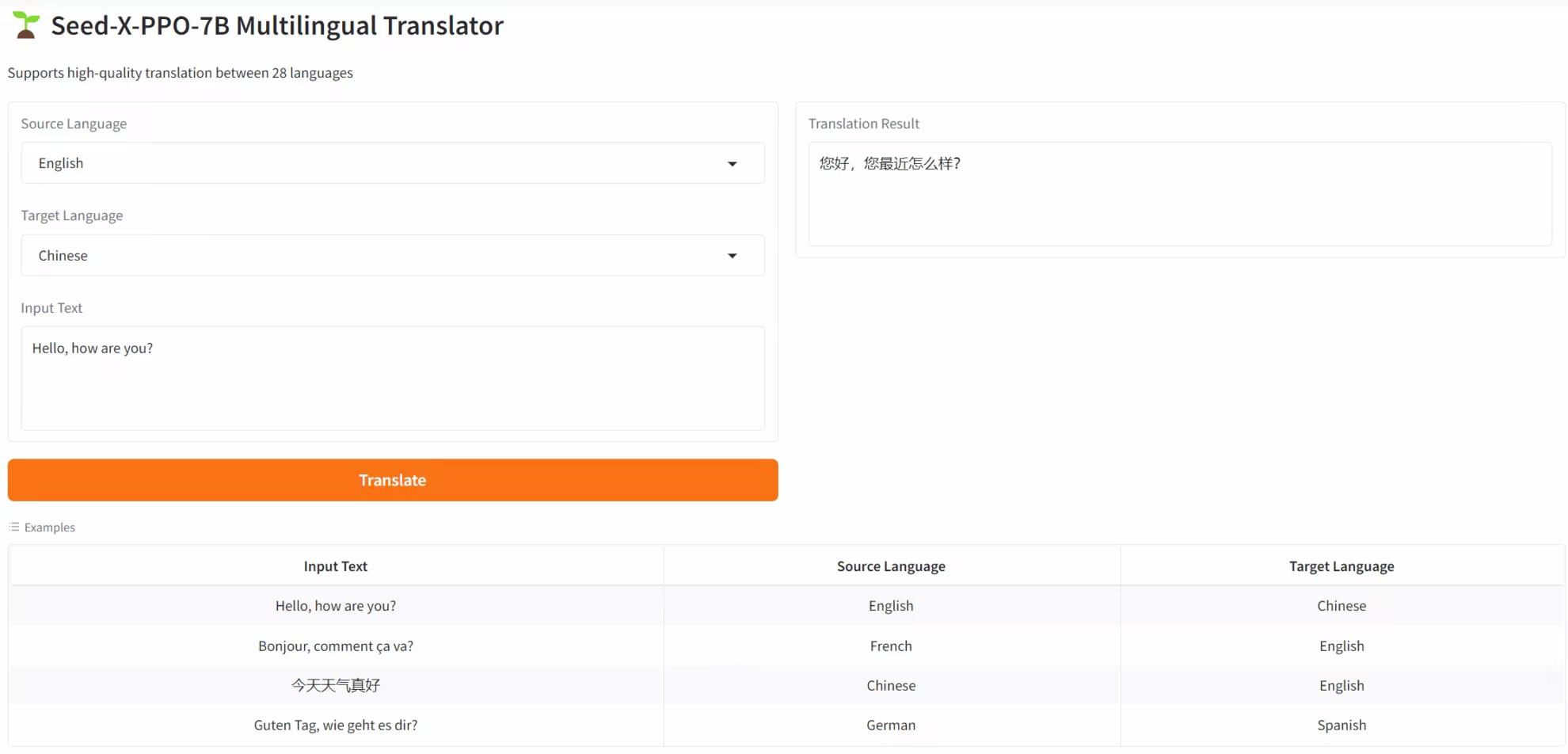 SEED-X-PPO-7B is a next-generation multilingual translation model released by the ByteDance Seed team. Based on iterative optimization using the Proximal Policy Optimization (PPO) reinforcement learning algorithm, its core goal is to address the need for high-precision semantic transfer in cross-language scenarios. This model overcomes the limitations of traditional translation models in adapting to minority languages, restoring cultural context, and ensuring coherence in long texts, supporting translation between 28 mainstream languages, including Chinese, English, and German.