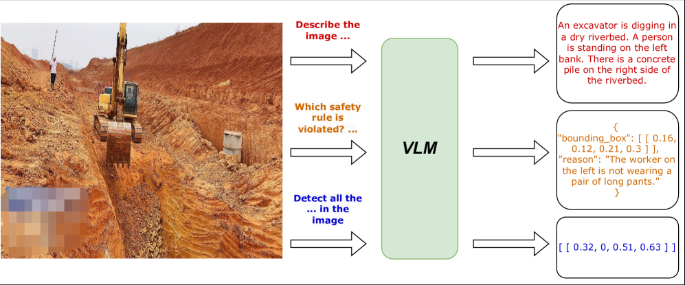 With the rise of powerful visual-language models (VLMs), researchers have begun exploring their applications in tasks such as detecting safety rule violations from site images. This paper proposes the ConstructionSite 10k dataset, which contains 10,000 images of construction sites and provides annotations for three interrelated tasks: image description generation, visual question answering (VQA) of safety rule violations, and visual grounding of construction elements.