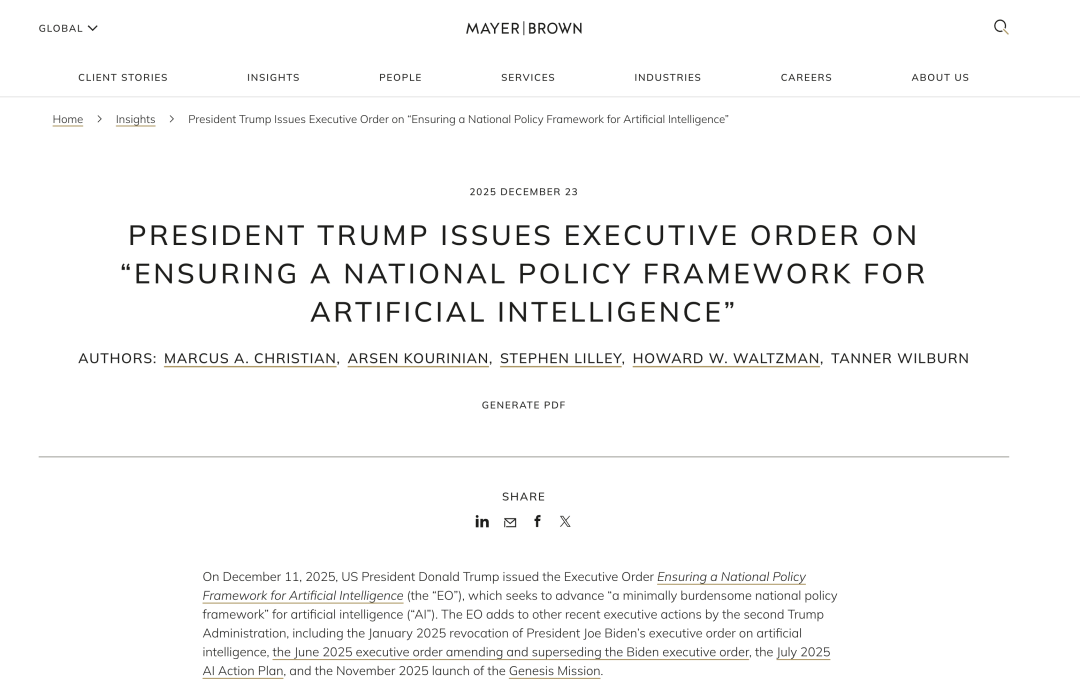 "This marks the U.S. government's formal challenge to the fragmented AI regulations of individual states, aiming to establish a unified, less regulated, and de-ideologized national AI regulatory legal system by seizing legislative power at the federal level," an editorial published by the law firm YENLEX pointed out. "Its fundamental strategic intention is to compete with China in the field of artificial intelligence by eliminating domestic legal barriers and integrating national infrastructure, computing power, and innovation resources in a national manner."