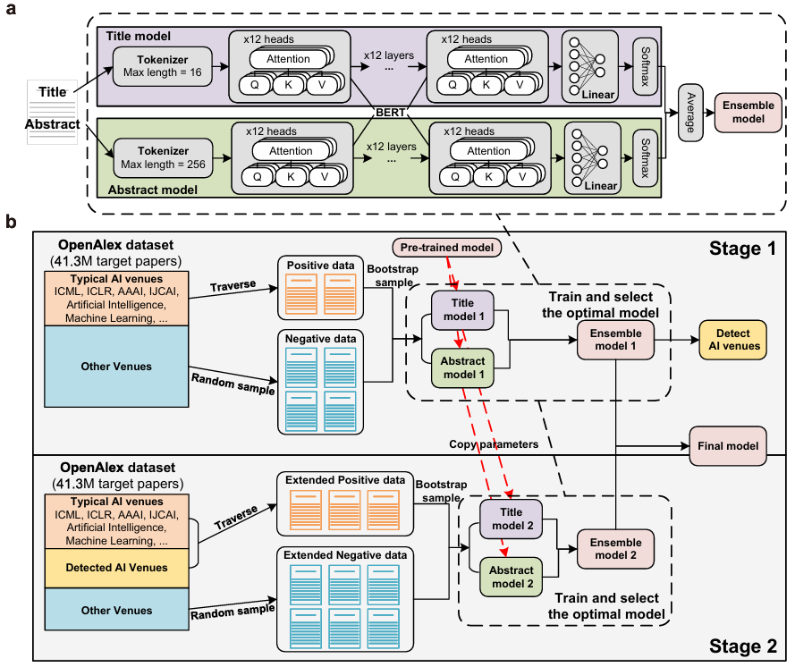 Traditional research often relies on keywords (such as "Neural Network") to screen AI papers, but this is highly susceptible to bias. This study employs a two-stage fine-tuning BERT model, trained separately on the paper title and abstract, and then integrates these results to make the final judgment.This method, after blind review by experts, achieved an F1 score as high as 0.875.This laid a solid and reliable data foundation for the entire study.