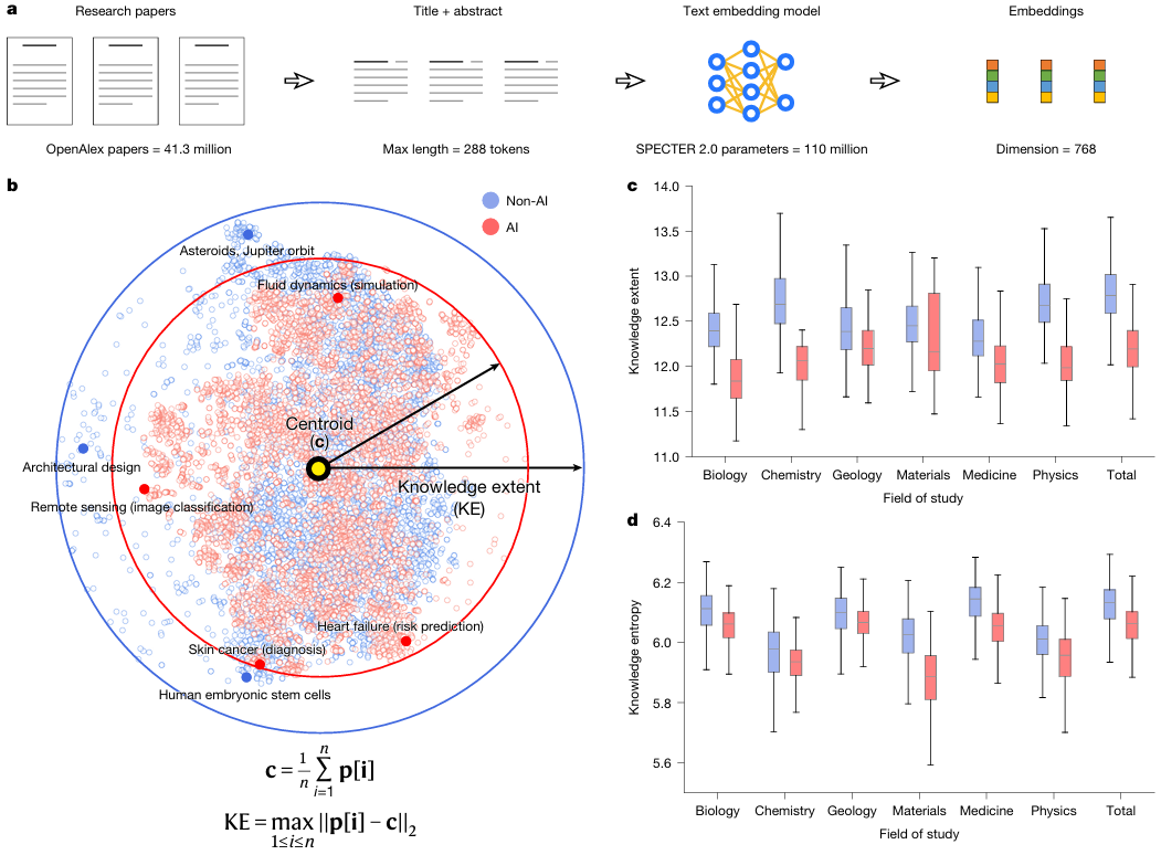 b: To facilitate visualization, researchers employed the t-distributed random neighborhood embedding (t-SNE) algorithm to compress the high-dimensional embeddings of 10,000 randomly selected papers (half of which were AI papers) into a two-dimensional space. As shown by the solid arrows and circular boundaries, the AI papers (whose knowledge breadth was calculated in the original space without dimensionality reduction) exhibit a smaller knowledge breadth across the entire natural sciences. Furthermore, the AI papers show a higher degree of clustering in the knowledge space, indicating a more focused attention on specific issues.