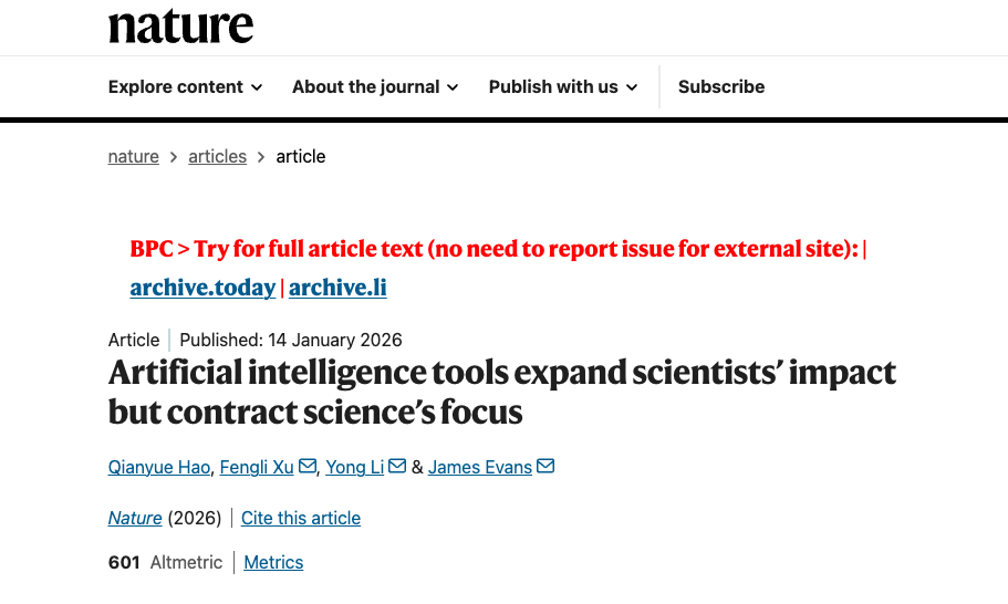 Recently,A research team from Tsinghua University and the University of Chicago published their latest research findings in Nature, titled "Artificial intelligence tools expand scientists' impact but contract science's focus."By analyzing data from 41.3 million natural science papers and 5.37 million scientists between 1980 and 2025, a startling paradox regarding AI for Science has been revealed: AI is a "super accelerator" for individual research, but an "invisible shrinkage device" for collective science. This study not only boasts a massive dataset but also employs a sophisticated analytical framework.This provides unprecedented systematic evidence for the industry's understanding of the fundamental impact of AI on science.