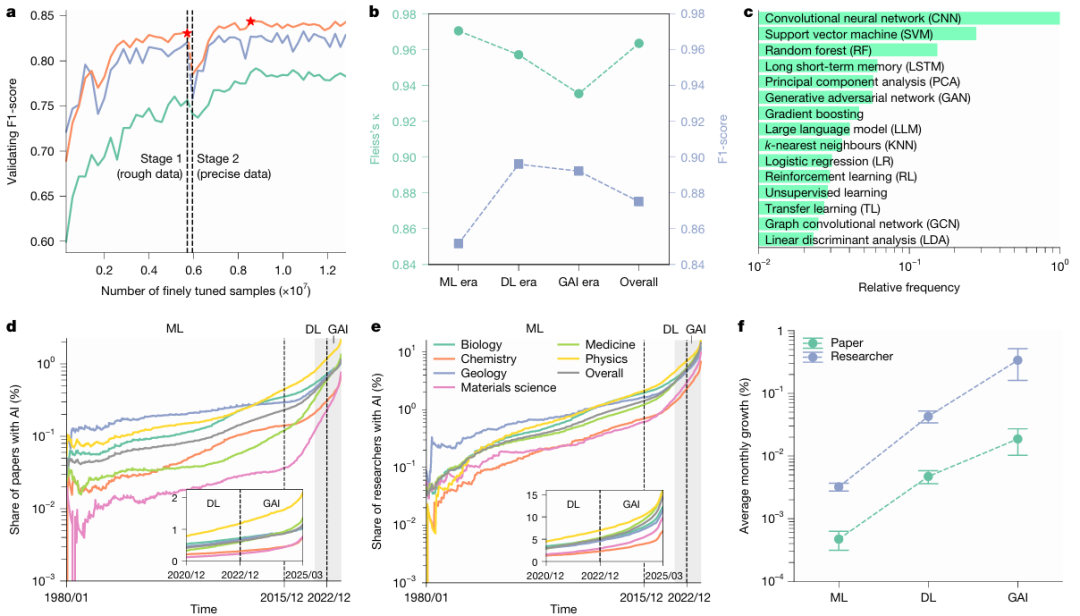 d, e: Growth of AI-enhanced papers (d, n = 41,298,433) and researchers employing AI (e, n = 5,377,346) across the selected scientific disciplines from 1980 to 2025, in the three periods of machine learning (ML), deep learning (DL), and generative AI (GAI). The vertical axis is logarithmic.