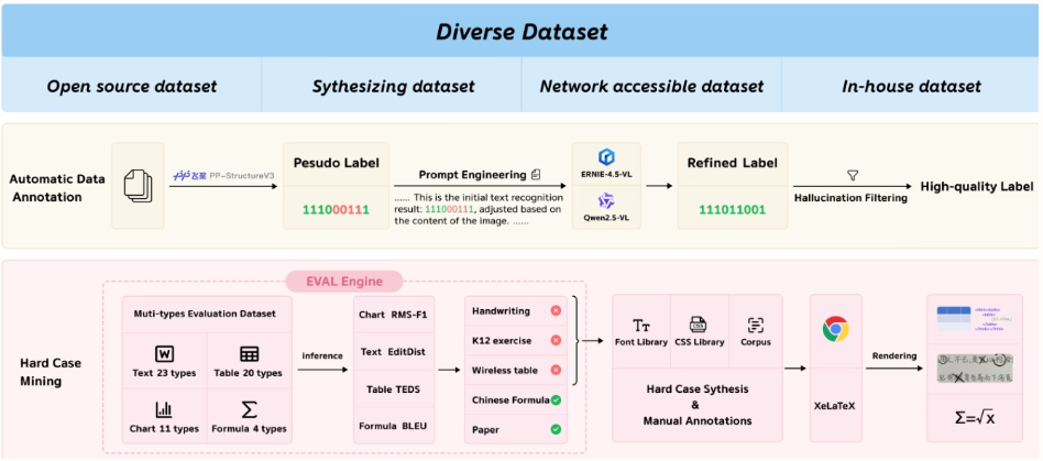 The training dataset consists of OCR 1.0, OCR 2.0, and general vision data, with OCR data accounting for 80% of the mixed training data. For evaluation, OmniDocBench v1.5 was used, a benchmark containing 1,355 pages of Chinese and English documents, covering journals, academic papers, and research reports across nine categories.