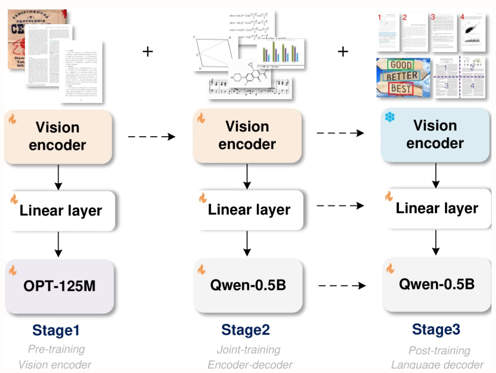 Researchers from StepFun, Megvii Technology, the University of Chinese Academy of Sciences, and Tsinghua University proposed GOT, a unified end-to-end OCR-2.0 model with 580 million parameters. Through a high-compression encoder and a long context decoder, it extends recognition capabilities from text to a variety of artificial optical signals—such as mathematical formulas, tables, charts, and geometric figures. It supports slice/full-page input, formatted output (Markdown/TikZ/SMILES), interactive region-level recognition, dynamic resolution, and multi-page processing, significantly advancing the development of intelligent document understanding.