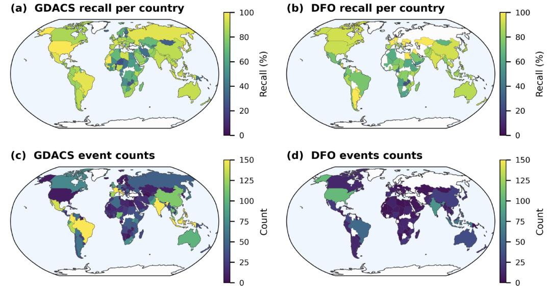 In the integrity assessment, the study compared Groundsource with the Global Disaster Alert and Coordination System (GDACS) and the Dartmouth Flood Observatory (DFO) through spatiotemporal matching. The results showed that since 2020, the recall rate for GDACS events ranged from 851 TP3T to 1001 TP3T; in regions with well-developed media infrastructure, such as the United States, the matching rates reached 961 TP3T (GDACS) and 911 TP3T (DFO), respectively. Furthermore,Recall rates are significantly correlated with the severity of disaster impact: recall rates for major flood events are close to or exceed 90%.