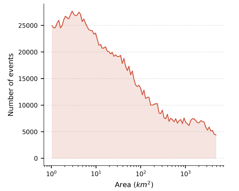 Despite reporting biases, Groundsource performs exceptionally well in terms of spatial resolution.Statistics show that the average coverage of extracted events is 142 square kilometers, of which 82% records are less than 50 square kilometers. Many events can be refined to the block or community scale, thus capturing localized floods that are often overlooked by traditional global disaster databases.