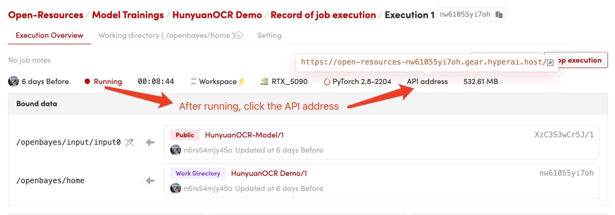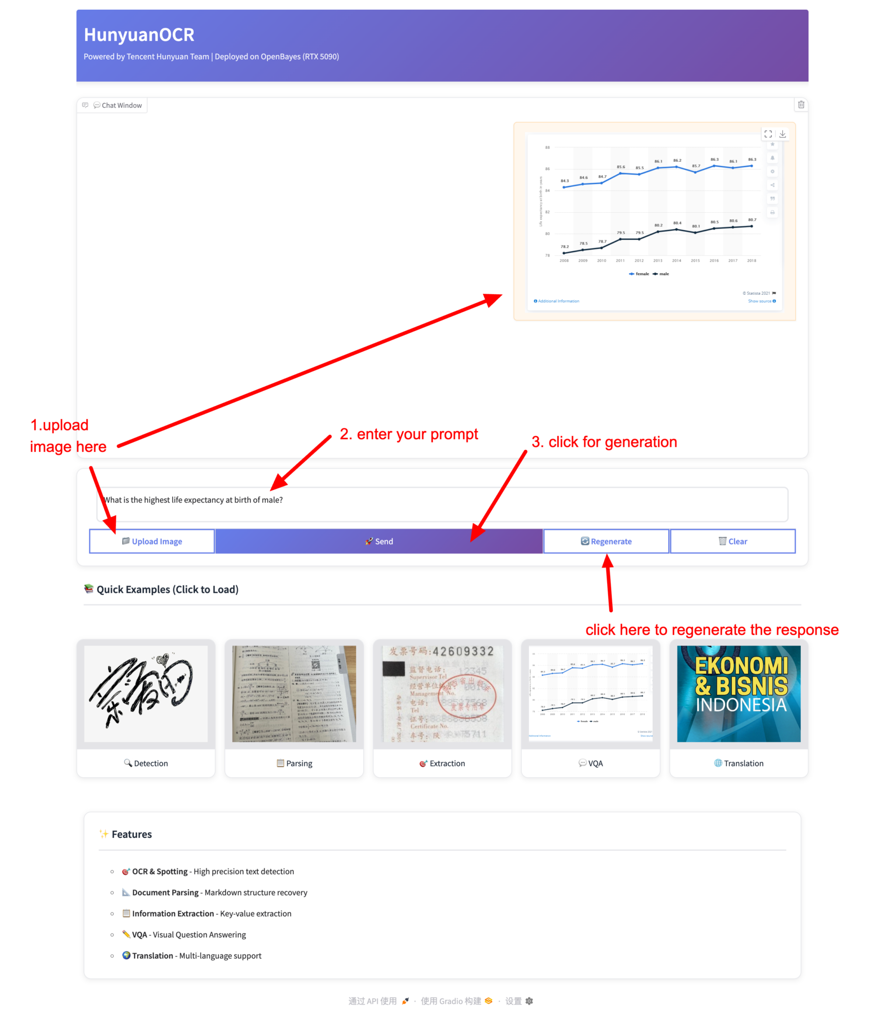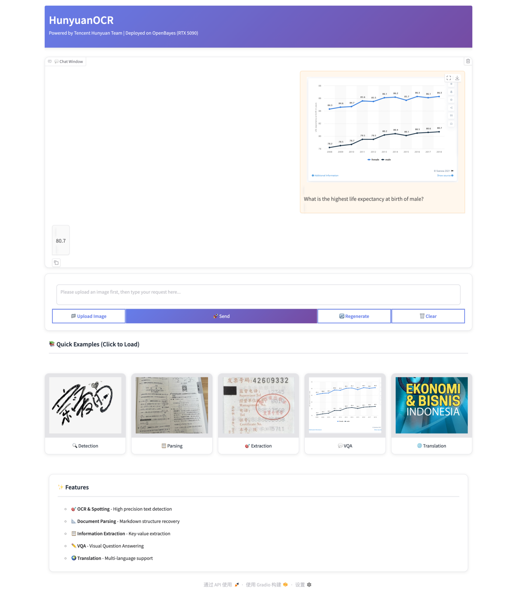 This tutorial demonstrates computing power on the OpenBayes platform using a single RTX 5090 GPU as the demonstration resource. It combines Transformers native inference with a visual web interface built using Grado, supporting one-click testing of various OCR tasks.