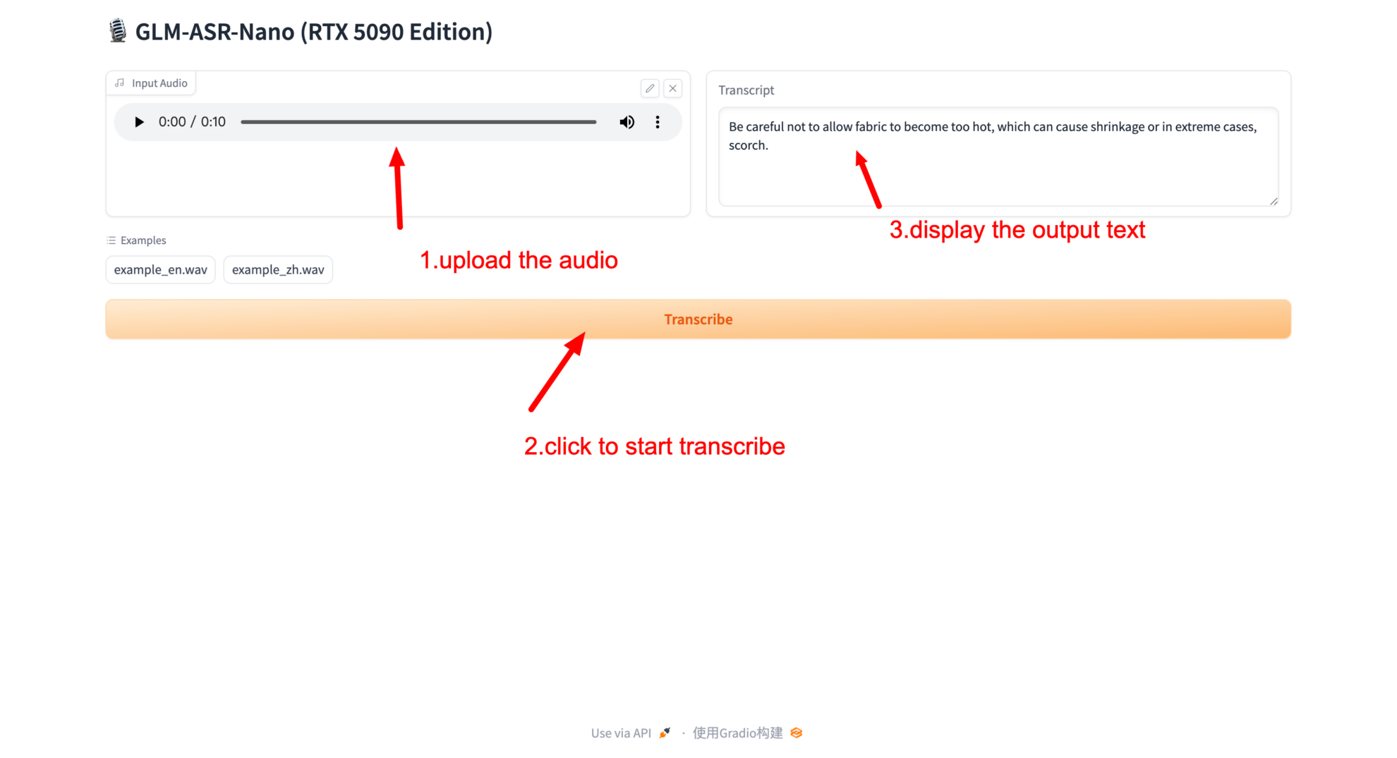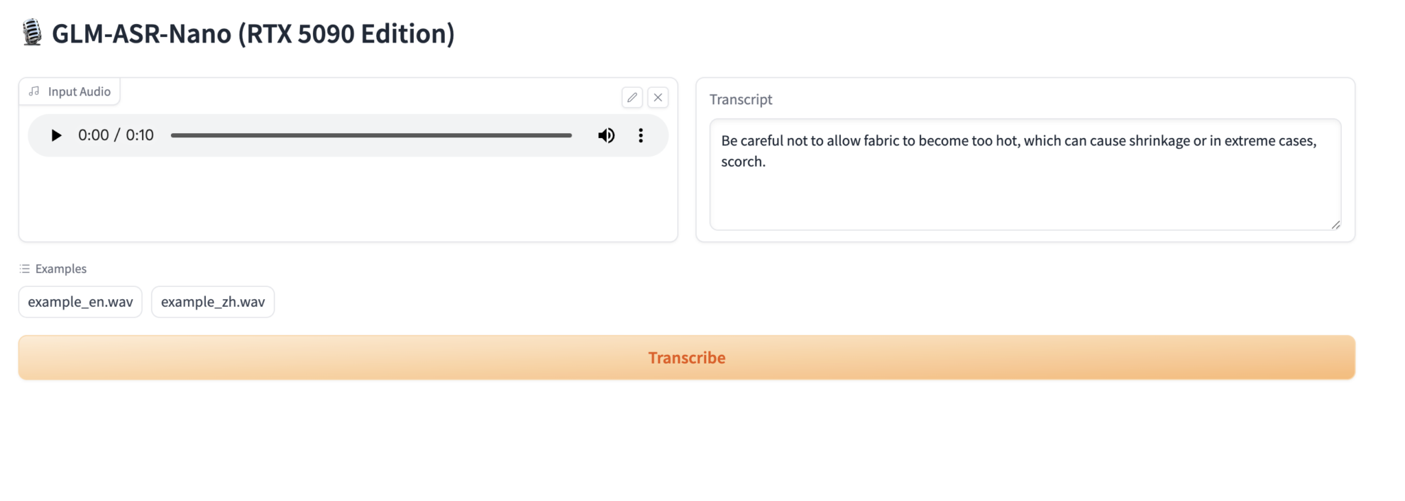 This tutorial uses Grado + Transformers to deploy GLM-ASR-Nano-2512 as a demonstration, employing the following computing resources: Single RTX 5090 .