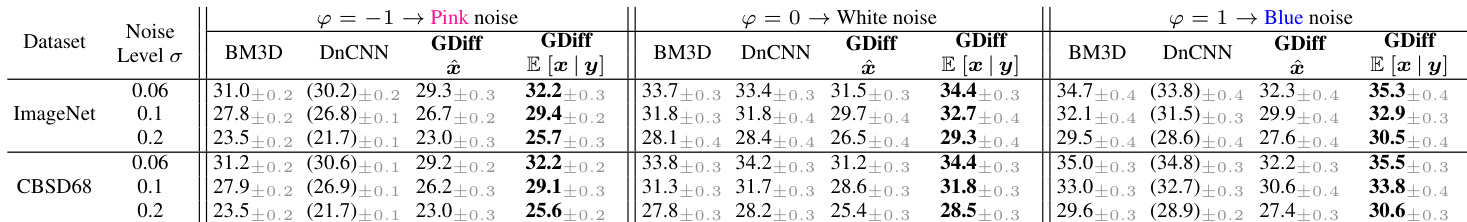 - On the ImageNet-based denoising task, GDiff achieved SSIM of 0.896 (posterior mean) and 0.882 (posterior sample), outperforming DnCNN (trained on white noise) and matching BM3D (non-blind) despite being blind.