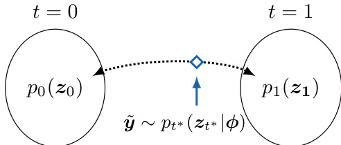 The figure above illustrates the reverse SDE process, which is central to the diffusion model's ability to sample from the posterior. It shows the transition from the initial distribution p0(z0), which corresponds to the prior p(x), to the final distribution p1(z1), which is a highly noisy distribution. The reverse process, starting from a point y~ at time t=1, flows backward in time to generate samples from the posterior distribution p(x∣y,ϕ). This process is defined by a reverse SDE that depends on the score function of the current distribution, which the diffusion model learns to approximate. The algorithm iterates between these two steps, using the diffusion model to sample the signal and the HMC sampler to sample the noise parameters, to generate samples from the joint posterior distribution.