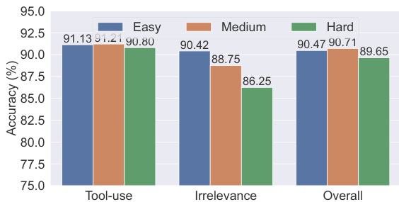 The chart compares model accuracy across different complexity levels for tool-use, irrelevance, and overall performance. Results show that medium complexity data yields the highest accuracy in tool-use and overall categories, while easy complexity performs best in irrelevance detection, indicating an optimal balance in data complexity for model training. Medium complexity data achieves the highest accuracy in tool-use and overall performance Easy complexity data shows the best performance in irrelevance detection Accuracy varies significantly across complexity levels, with medium complexity being optimal for most tasks